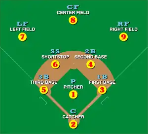 With a runner on base and taking a lead, the pitcher may attempt a pickoff, a quick throw to a fielder covering the base to keep the runner's lead in check or, optimally, effect a tag out.[35] Pickoff attempts, however, are subject to rules that severely restrict the pitcher's movements before and during the pickoff attempt. Violation of any one of these rules could result in the umpire calling a balk against the pitcher, which permits any runners on base to advance one base with impunity.[36] If an attempted stolen base is anticipated, the catcher may call for a pitchout, a ball thrown deliberately off the plate, allowing the catcher to catch it while standing and throw quickly to a base.[37] Facing a batter with a strong tendency to hit to one side of the field, the fielding team may employ a shift, with most or all of the fielders moving to the left or right of their usual positions. With a runner on third base, the infielders may play in, moving closer to home plate to improve the odds of throwing out the runner on a ground ball, though a sharply hit grounder is more likely to carry through a drawn-in infield.[38]