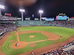 Unlike those of most sports, baseball playing fields can vary significantly in size and shape. While the dimensions of the infield are specifically regulated, the only constraint on outfield size and shape for professional teams, following the rules of MLB and Minor League Baseball, is that fields built or remodeled since June 1, 1958, must have a minimum distance of 325 feet (99 m) from home plate to the fences in left and right field and 400 feet (122 m) to center.[128] Major league teams often skirt even this rule. For example, at Minute Maid Park, which became the home of the Houston Astros in 2000, the Crawford Boxes in left field are only 315 feet (96 m) from home plate.[129] There are no rules at all that address the height of fences or other structures at the edge of the outfield. The most famously idiosyncratic outfield boundary is the left-field wall at Boston's Fenway Park, in use since 1912: the Green Monster is 310 feet (94 m) from home plate down the line and 37 feet (11 m) tall.[130]