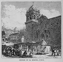 The Basilica of La Merced was founded by Friar Sebastián de Trujillo Castañeda between 1535 and 1536.[5][6] By 1538, Francisco Pizarro donated to the Mercedarians the estate called Limpipata adjacent to the Kusipata square where the construction of the first Mercedarian church in the city began.[6] The current church replaced the first church destroyed by the earthquake of 1650. The current church had to be built between 1651 and 1670 while the tower had to be built between 1692 and 1696 as well as the second cloister of the convent.