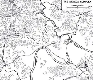 I Corps commander General Bruce C. Clarke advocated defense on the hills north of the MLR to deny the tactical advantage they offered to the PVA. Vegas was the highest of the "Nevada Cities" and 1,310-yard (1,200 m) north from the MLR. "From North to South this observation included in its 180-degree sweep, enemy hill mass 57 to the right, friendly outpost Berlin, the MLR, key Marine defense highpoints, Hills 229 and 181 in the 1st Marines sector, and intervening terrain."[4]: 276 However, soldiers on Vegas could not see Reno. A rifle platoon of 40 Marines and two Navy corpsmen manned each outpost.[4]: 265 250-yard (230 m) of trench line surrounded the outpost, which ranged from 4–8-foot (1.2–2.4 m) deep. Beyond the trenches two parallel lines of barbed wire lay, linked with more parallel aprons of wire connecting the two, sometimes referred to as the "Canadian system.[1] Outpost Reno, formerly Outpost Bruce, had been the scene of intense fighting from 5–6 September 1952 during the Battle of Bunker Hill and 3 Marines were awarded the Medal of Honor for their actions there, 2 posthumously.[5]