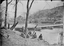Richardson sent out a portion of the 1st Massachusetts Infantry towards the Confederate line. The Massachusetts regiment wore gray uniforms instead of the standard Union blue, which caused initial confusion, as the Confederates were also clad in gray.[8] After the 1st Massachusetts, Richardson deployed the 1st Michigan Infantry, 2nd Michigan Infantry, 3rd Michigan Infantry, and 12th New York Infantry regiments.[9] The Union advance met initial resistance from the 1st Virginia Infantry, 11th Virginia Infantry, and 17th Virginia Infantry regiments of Longstreet's brigade. Tyler ordered Ayres to move his guns closer to the action, accompanied by cavalry, and he sent the rest of Richardson's brigade toward the ford. The 12th New York Infantry began to retreat under heavy fire, exposing the rest of Richardson's line, particularly the 1st Massachusetts, to Confederate fire. Ayres, his battery having used up much of its ammunition, withdrew his two howitzers from the field. During the exchange, Union cannons fired an estimated 415 shots, and the Confederate cannons fired an estimated 310. Tyler realized that the Confederates had a strong force at the ford, and ordered the rest of his infantry to withdraw.[2] After Richardson's brigade had completed its withdrawal, a second of Tyler's brigades commanded by William T. Sherman arrived on the field, although Sherman's brigade was only subjected to light shelling.[10]