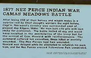 On August 18, the Nez Perce camped at Camas Meadows fifteen miles (24 km) to Howard's east in a meadow bisected by Spring and Camas creeks. The Nez Perce name for their camp was Kamisnim Takin, meaning "camas meadows".[13] Howard marched to Camas Meadows on August 19. The Nez Perce had departed earlier that day, continuing eastward. Howard set up camp there that night, calling it Camp Callaway, and took "great pains" to "cover the camp with pickets in every direction."[14]