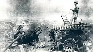 A Vietnamese soldier standing on the wreckage of a Chinese tank in the Battle of Cao Bằng