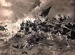 Despite being ordered three times by Noailles to hold their position, around midday the elite Maison du Roi cavalry charged the Allied lines.[17] Who initiated it is disputed, de Gramont being the most common choice; French historian De Périni suggests the Maison de Roi, who had not seen action since Malplaquet in 1709, saw an opportunity to win the battle on their own and led by the duc d'Harcourt, they broke through the first three lines, throwing the inexperienced British cavalry into confusion.[18]