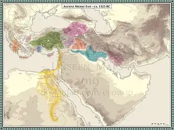 The Hayasa-Azzi are first recorded when they are one of multiple people groups who invaded the Hittite kingdom during the difficult reign of Tudhaliya II (c.1360 – 1344 BC (short chronology)). Not much about them is known but they were likely a political confederation of multiple small kingdoms (the two most prominent being, of course, the Hayasa and Azzi) whose heartland was located in the Armenian Highlands.[1] They are reported to have seized the important Hittite city of Samuha[3] before Tudhaliya sent his son, general and later Hittite King Suppiluliuma against them. Suppiluliuma defeated the Hayasa-Azzi and forced them to return the captured Hittite territory and become Hittite vassals, thus ending the first period of conflict between the two nations.[3][4]