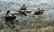The main Chechen forces began to escape on the last day of January and first day of February during a winter storm, after an attempt to bribe their way out. A reconnaissance party they sent ahead failed to return but the commanders decided to leave anyway.[28] Some 4,000[29] rebel fighters and some civilians,[30] moving in a southwesterly direction, were met with heavy artillery fire. The column of some 2,000 fighters, several hundred non-combatants and 50 Russian prisoners of war, entered a minefield between the city and the village of Alkhan-Kala. The Russian forces ambushed them as they were crossing a bridge over the Sunzha River and bombarded them with artillery. The Chechens pushed on through the minefield, being unaware of it and lacking engineers.[28] Scores of rebel fighters were killed by the combination of artillery fire and the crossing of the minefield, including several top Chechen commanders: Khunkar-Pasha Israpilov, the city's mayor Lecha Dudayev and Aslambek Ismailov, the commander of the defense of Grozny. The rebels said they lost about 400 fighters in the minefield at Alkhan-Kala,[31] including 170 killed. About 200 of the wounded were maimed, including Abdul-Malik Mezhidov and Shamil Basayev, (the latter stepping on a mine while leading his men).[32] In all, there were at least 600 casualties during the escape. Russian generals initially refused to admit that the Chechens had escaped from the blockaded city, saying that fierce fighting continued within the city. President Vladimir Putin's aide and the Russian government's spokesman on Chechnya Sergei Yastrzhembsky, said that if the rebels abandoned Grozny, "we would have informed you".[33] Gen. Viktor Kazantsev asserted that as many as 500 rebels were killed during the breakout.[34]