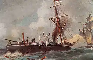 The ships collided under a steep angle; although the hull of the Meteor managed to resist the ramming attempt, the shock of the impact collapsed her rigging, sending sails and debris on her deck and, most significantly, wrapping lines around her propeller. German sailors attempted to use the opportunity to try and board the Bouvet, but the French sailors repelled them with rifle fire and the Bouvet quickly retreated to a safer distance.[9] As the Bouvet was preparing to ram the immobilised Meteor again, a German shell struck her exposed boiler, allowing her steam to leak on deck and rendering her dead in the water as well.[9] The Bouvet then unleashed her sails and disengaged from the action, as German sailors attempted to free their propeller and give chase. As Bouvet reached Cuban territorial waters, the Spanish intervened to stop the battle, with the Spanish corvette Hernán Cortés firing a warning shot at the Meteor to signal to her that the engagement was over. Both the Bouvet and Meteor then sailed back to Havana.
