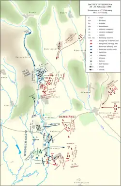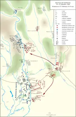 Dembiński made Tiszafüred his base of operations and intended to fight the decisive battle around Mezőkövesd and Eger.[4] The plan was that, before this, two divisions of the Hungarian army had to carry out a Demonstration (military) against the K.u.K. Brigade defending the city of Szolnok to divide the Austrian main army, by attracting there important enemy units.[7] Then the Hungarian main forces would advance along the Pest highway and cut off the Austrian forces trapped in the Szolnok area, and after the decisive victory around Kápolna and Eger, would liberate the capital.[7] However, Dembiński was so obsessed with his plan that he forbade even the effective pursuit of the isolated Schlik corps, on the assumption that if Schlik was severely defeated, Windisch-Grätz would not dare to move out from Budapest, and then his much-desired battle between Mezőkövesd and Eger would not be fought.[8] Dembiński intended to launch the attack in early March.[8] This explains why, when Klapka tried to attack Schlik's corps from two directions at Pétervására on 24 February, Dembiński ordered one of his columns back, and the desired success was again prevented by the commander-in-chief.[8] At the same time, Dembiński wanted to wait before attacking the main army, because János Damjanich's and Károly Vécsey's divisions would have arrived at Szolnok site by then, in order to carry out the planned diversionary attack, and until then he intended to take up a position along the Tarna river’s line with his main force.[9] But surprisingly, he did not wait for that to happen, and on the 24th he had already ordered his troops to advance.[9]