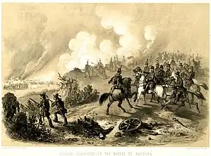 Among the English versions, Julian Kune/Kuné Gyula (1831-1914), a former Hungarian Honvéd and a fighter in the American Civil War, quotes an excerpt from the prayer text in his book Reminiscences of an Octogenarian Hungarian Exile, published in Chicago in 1911, entitled Kossuth's Prayer after the Battle of Kápolna.[37] In describing the Battle of Kápolna, the author compares many of its details to the Gettysburg Address which followed the Battle of Gettysburg (1863); showing that Kossuth, like Abraham Lincoln, consecrated the battlefield after the bloodshed with an unforgettable prayer.[37] The popularity of the prayer is indicated by the fact that woodcuts depicting Kossuth praying over the heroes at Kápolna were already being produced abroad in 1849.[32]