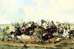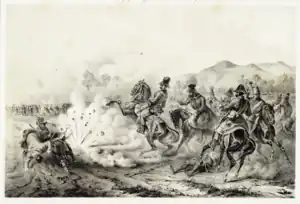 He could see this for himself the day after the battle. On 28 February, the Hungarian army concentrated at Mezőkövesd was pursued by the cavalry brigade of Major General Franz Deym of the Schlik Corps.[24] Deym's seven companies of cuirassiers ambushed the cavalry of the rearguard Kmety division, and his artillery unleashed a devastating cannonade on the Hungarians.[24] Colonel András Gáspár received an order, probably from Aulich, to help Kmety's troops with the 9th Hussars.[24] For the first time in his life, the Colonel was able to lead the entire regiment, the unit he had served in for 28 years, in a charge against his own regimental commander.[24] As soon as Gáspár and the regiment reached the same line as the Hungarian position, with two squadrons of hussars, he attacked from the flank, the enemy battery which was continuously firing on the Hungarian center and left wing.[24] Major Kornél Görgei volunteered for the assault and received permission from Gáspar to attack the cannons, which was carried out immediately by the Hussars.[24] A company of the 13th (Hunyadi) Hussar Regiment joined the cavalry battle, while Kmety's companies of the 10th (William) Hussar Regiment also participated in the fight.[24] The Hussars immediately captured two guns (three according to another source), two ammunition wagons, 29 prisoners (including an officer) and 20 horses.[24] The cuirassiers fled in desperation as far as the Szihalom heights, where they were picked up by the Montenuovo cavalry brigade.[24] Encouraged by this victory, the Hungarian army began to advance again against the troops of Windisch-Grätz, but the overly cautious Dembiński stopped it and ordered his soldiers back to Tiszafüred, behind the Tisza.[3]