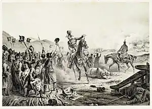 However, at the same time as the Austrians were breaking in Kál, the Hungarians from the center were preparing to retake Kápolna, and Aulich, who tried his best to defend Kál, received orders from Dembiński to march north with his troops to support this attack.[23] Aulich set off towards Kápolna, but on the way he was informed that the K.u.K. troops had in the meantime pushed the Kisfaludy Brigade, which he left to defend Kál, out of the village. Driven by this concern, he returned with his troops towards Kál, but before he could reach it, Dembiński ordered him to begin his retreat.[24] Therefore, Aulich's infantry was no longer sent to retake the village but immediately began to retreat.[18] The soldiers of the Kisfaludy Brigade, who did not retreated yet from Kál, were trapped in the village, and cut off from their own units by the imperial artillery and cavalry. These soldiers formed an infantry square, and moved out of the village under the enemy’s heavy attacks, escaping this trap with relatively few casualties.[18]