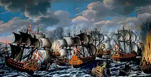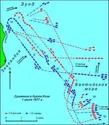 Despite the defeat the previous year, the Swedish navy was in the Spring of 1677 still numerically superior to the Danish navy and posed a considerable threat. The Danish sea forces were reorganized off Zealand and the need to secure the sea lanes between Denmark and Skåne was of paramount importance. The Dutch allies of Denmark promised to send reinforcements. Cornelis Tromp, an experienced admiral who commanded the combined Dutch-Danish fleet the year before had been sent to speed up the arrangements, but would not reach Copenhagen until 2 July.[3] The Swedish navy, on the other hand, had major difficulties securing supplies and equipment for its ships and were unable to recruit enough manpower.[4]