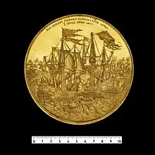 Gold medal struck in 1677 to commemorate the Danish victory from the collections of the National Museum of Denmark; the medal depicts the Swedish Caesar being captured and having her colors struck