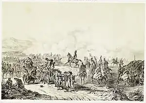 Only the right flank, led by Aristid Dessewffy, withstood the enemy cannon fire.[8] Dessewffy with the 26th Honvéd Battalion managed to stop the attack of the Imperial infantry, and with the Coburg Hussars he forced two enemy guns to retreat.[15] Dessewffy's 42nd Hussars almost reached the enemy's rocket battery on the Akasztófa hill, when the Archduke Wilhelm infantry, which had been in reserve, countered the Honvéd attack in time and even repulsed it with a successful counterattack.[9] At 3.30 p.m. Dessewffy's troops also wavered, but the Lieutenant-Colonel ordered the retreat to Enyicke in time, both for his own troops and for those of Major Rembowszky, who was fighting on his right.[9] It was up to these units - the 26th, 20th Honvéd Battalions, 1 Company of the 17th Honvéd Battalion (the latter two were subordinated to Dessewffy after the centre had been routed), the Polish Legion and the Coburg Hussars - to cover the retreat of the whole corps.[2][15] The biggest problem was the transfer of guns and ammunition wagons across the swift Miszlóka stream, which was made more difficult by the desperate fleeing of some troops, such as the Lehel Hussars, across the stream.[2]