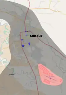 The Battle of Kunduz took place from April to October 2015 for control of the city of Kunduz, located in northern Afghanistan, with Taliban fighters attempting to seize the city and displace Afghan security forces. On 28 September 2015, the Taliban forces suddenly overran the city, with government forces retreating outside the city. The capture marked the first time since 2001 that the Taliban had taken control of a major city in Afghanistan.[12] The Afghan government claimed to have largely recaptured Kunduz by 1 October 2015 in a counterattack, although local sources in the city disputed the claim made by government officials.[13][14]