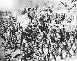 The Battle of Małogoszcz took place on 24 February 1863 near Małogoszcz in the Holy Cross voivodeship. It was the one of biggest battles of the January Uprising. Polish general Marian Langiewicz began concentrating his forces in the Holy Cross Mountains; he wanted to attack Warsaw with them, but the Russians unveiled his attempts. He was attacked by a few Russian forces simultaneously. Langiewicz defeated them all in many skirmishes. Polish forces grew to 2,600 men most of them peasants armed with scythes. Russian colonel Vladimir Dobrovolsky attacked near Małogoszcz. The Russians shelled Polish positions, but their attack was eventually smashed by a Polish cavalry counterattack. Langiewicz ordered a retreat. The battle was indecisive - the Russians failed to annihilate the Polish army and the Polish failed to defend their positions.