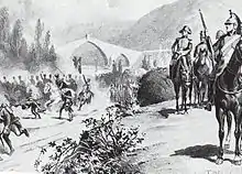 Black and white print shows several horsemen and two pack mules in the foreground while a battle rages in the background.