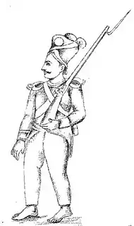 A Nair Sepoy of Travancore, drawn in 1878: A portion of Travancore army during Dharma Raja's reign was trained and disciplined in European manner.
