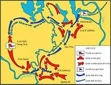 Le Loi's forces began advancing north. By November, general Lý Triện's forward detachments had arrived near Đông Quan. The Ming garrison assumed that this was the main Lam Sơn army, and went out to confront them near Ninh Kiều. The Ming were defeated, suffering 2000 casualties.[8] Three days after the initial engagement, another engagement occurred at the Nhân Mục bridge, in which another thousand Ming soldiers reportedly became casualties. The deteriorating situation forced generals Li An and Fang Zheng to withdraw their forces from Nghe An by sea and general Ma Ying to redeploy forces in order to rescue Đông Quan, as reinforcements from Yunnan had been ambushed by Trịnh Khả and fled to the citadel of Tam Giang.[9] Together, these forces bolstered the garrison of Đông Quan.
