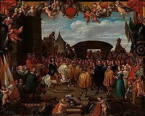 The Battle of Valenciennes became the subject poems, songs, artworks, prints, coins, and publications, including several paintings by Flemish artists like David Teniers II and Pieter Snayers. Teniers, who was the court painter at Brussels, depicted the relief in a canvas using all the topographical, allegorical and rhetorical means of the Baroque imagery.[58] The commanders of the army, including John Joseph, the Prince of Condé and the Marquis of Caracena, were portrayed along a bust of Philip IV. In the painting, John Joseph appears in horseback, performing a levade, a position which makes reference to his leadership abilities.[59] Snayers, a celebrated battle artist, was commissioned to depict the battle in a large canvas. It was owned by the Count of Peñaranda, who had led the Spanish delegation at the Peace of Münster, and, on his death on 1676, it was acquired by Ferdinand Bonaventura von Harrach, Imperial ambassador at the Spanish court.[60] The painting was much celebrated, and the rederijker Cornelis de Bie devoted more space to it in his work Het Gulden Cabinet (1662), a collection of biographical sketches of Flemish and Dutch painters, than to any other painting.[61]