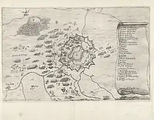 The garrison of Valenciennes consisted of 2,000 infantry and 300 cavalry soldiers led by Alexander de Bournonville, Count of Henin, which were reinforced gradually by 6,000 armed burghers.[19] The Spanish Tercio of Francisco de Meneses Brito was entrusted the guard of the gate of Anzin, on the citadel, which gave access to the river, while Bournonville's own German regiment was positioned to protect the gates of Lille and Le Quesnoy, the Walloon Tercio of the Count de La Motterie was detached to protect the gate of Mons, and the burghers took care of the gate of Famars, the Tourelle —a small palace belonging to the Society of Jesus on the right bank of the Scheldt— and the redoubt of St. Ignace. The Walloon Tercio of Maestre de Campo Verkeest, which was garrisoning the nearby town of Saint-Amand, tried to reinforce Valenciennes, but could not get across the French lines[20]