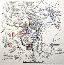 By 2 p.m. the Württembergers had been dislodged from Bleddin, and Beaumont's cavalry swept aside by the Prussian Hussars. Wartenburg was now threatened from the east by Steinmetz and from the south by Mecklenburg.[5] The decisive blow came from Horn's brigade. Passing through an orchard, and crossing a stream and two dikes, they fell upon Fontanelli's men, who had been called forward to reinforce Morand.[8]