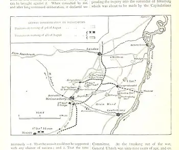 In August, Marshal MacMahon concentrated his effectives at Haguenau with the object of warding off any attempt on the strategic StrasbourgHaguenauBitcheMetz rail lines, and established the following positions: Ducrot's 1st Division broke camp on 4 August and established itself at Lembach in order to secure contact with General Failly's V Corps; Douay's 2nd Division reoccupied Wissembourg, Weiler and the nearby countryside, namely the soft hills by the Col du Pigeonnier.[5] The 1st Cavalry Brigade would patrol the frontier east of Wissembourg up to Schleithal.