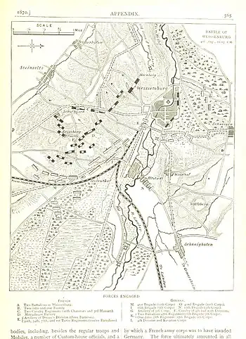 The Battle of Wissembourg or Battle of Weissenburg,[lower-alpha 1] the first of the Franco-Prussian War, was joined when three German army corps surprised the small French garrison at Wissembourg on 4 August 1870.[lower-alpha 2] The defenders, greatly outnumbered, fought stubbornly "especially considering they were surprised and greatly outnumbered, that the French sustained their old renown as fighting men and that the first defeat, although severe, reflected no discredit on the soldiers of the 1st Corps."[2] The fall of Wissembourg allowed the Prussian army to move into France and compelled Marshal Patrice MacMahon to give battle, and suffer defeat, at the Battle of Wörth on 6 August.