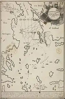 On March 27, 1719, a Dano-Norwegian naval force, consisting of four ships of the line and a frigate, anchored in Rivö bay outside of Gothenburg. The blockading force was under the command of Tordenskjold, who had recently been promoted to the lower admiral rank of schout-bij-nacht. To avoid endangering the peace conference that was taking place in Stockholm in the spring, Tordenskjold had been ordered not to assault Gothenburg.[31] In early June, the blockading naval force had increased to seven ships of the line, two frigates, four barges, two floating batteries, one bombarderskip, five galleys and two galiots. The smaller Danish vessels attempted to halt Swedish naval traffic between Nordre river and Marstrand. In mid-June, an additional 26 Danish merchant ships arrived from Öresund with storage for the Danish blockading fleet.[32]