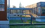 The extension building (Component IX) designed by Schrölkamp, completed in March 2007, is located at the boundary with the Botanical Garden and aligns with the neighboring buildings. This new structure is connected to the other buildings via a bridge. The extension comprises 40 offices on two upper floors. The lowered ground floor contains the dining room and serving area, while the kitchen, technical rooms, and storage areas are in the basement. The design of the extension aims to harmonize the rational, cuboid building form with the natural surroundings.[37] To achieve this, a pergola-like porch was added to the northwest façade, facing the orangery, to create a connection with the adjacent garden through plant growth. The scaffolding in front of the offices is adorned with dwarf pines, slash maple, hawthorns, and bamboo. The two front sides of the extension are clad with panels of burnished brass,[38] thus contrasting in color with the rest of the building without standing out too much.