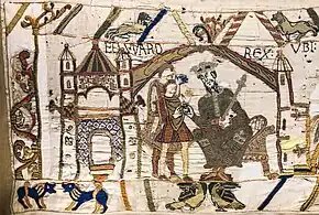 A scene from the Bayeux Tapestry depicting Bishop Odo rallying Duke William's army during the Battle of Hastings in 1066