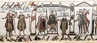 The tapestry's narration seems to place stress on Harold's oath to William, although its rationale is not made clear.[20] Norman sources claim that the English succession was being pledged to William, but English sources give varied accounts.[20] Today it is thought that the Norman sources are to be preferred.[38] Both the tapestry and Norman sources[39] name Stigand, the excommunicated archbishop of Canterbury, as the man who crowned Harold, possibly to discredit Harold's kingship; one English source[40] suggests that he was crowned by Ealdred, archbishop of York, and favoured by the papacy, making Harold's position as legitimate king more secure. Contemporary scholarship has not decided the matter, although it is generally thought that Ealdred performed the coronation.[41][42]