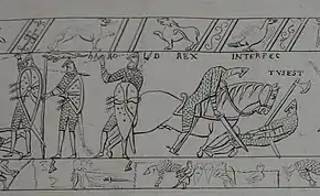 The identification of Harold II of England in the vignette depicting his death is disputed. Some recent historians disagree with the traditional view that Harold is the figure struck in the eye with an arrow, and that the arrow is a later 18th/19th century modification following a period of repair.[20] Benoît's engraving of 1729, and Bernard de Montfaucon's engravings of the tapestry as it was in 1730, show a spear or lance in place of the arrow and no arrow fletchings. Further, needle holes in the linen suggest that something has been removed, or shortened, and fletchings added to form an arrow.[20] A figure is slain with a sword in the subsequent plate, and the phrase above the figure refers to Harold's death (interfectus est, "he is slain"). This would appear to be more consistent with the labeling used elsewhere in the work. It was common medieval iconography that a perjurer was to die with a weapon through the eye. Therefore, the tapestry might be said to emphasize William's rightful claim to the throne by depicting Harold as an oath breaker. Whether he actually died in this way remains a mystery and is much debated.[35]