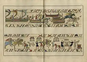 The tapestry was first briefly noted in English in 1746 by William Stukeley, in his Palaeographia Britannica.[22] The first detailed account in English was written by Smart Lethieullier, who was living in Paris in 1732–3, and was acquainted with Lancelot and de Montfaucon: it was not published, however, until 1767, as an appendix to Andrew Ducarel's Anglo-Norman Antiquities.[21][23][24]