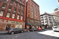 The Beach-Knapp District encompasses a collection of six 19th-century buildings in the Chinatown neighborhood of Boston, Massachusetts. It is centered at the corner of Beach and Knapp Streets, and includes three buildings on the south side of Beach Street, and three on the east side of Knapp. The buildings encapsulate the transition of the area from a predominantly residential area to a mixed residential-light industrial area in the 19th century. At 5 and 7 Knapp Street stand two Greek Revival residential structures, both built in the 1830s. The four story Renaissaince Revival building at 7-15 Beach Street was built c. 1885, and was historically used as a hotel. The other three buildings, 17-23 Beach, 25-29 Beach, and 9-23 Knapp, are all commercial buildings dating between 1885 and 1906; two of them were designed by Shepley, Rutan and Coolidge.[2]