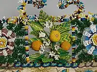 One technique of European beadwork is beaded "immortal" flowers. The technique's origins, though indistinct, are generally agreed to range at least several centuries back, as far back as at least the 16th if not 14th century.[13][14] Two mayor styles were developed: French beading, in which the wire only goes through each bead once and the wires are arranged vertically, and Victorian (also called English or Russian) beading, in which the wires go through each bead twice and are arranged horizontally.[13] In the late 19th and early 20th century, the beaded flowers were used to create long lasting funeral wreaths, called immortelles (French for "immortals").[14] In the mid-20th century, the art was introduced to United States with sales of flower beading kits. In 1960s to 1970s, books by emerging beaded flower designers emerged.[13][14] In the 1990s and 2000s, there was another revival of interest in the craft, exemplified for example by the funeral wreaths made to commemorate September 11 attacks victims.[13]