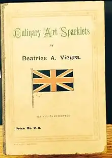 Beatrice A. Vieyra wrote a cookbook with Anglo-Indian recipes at the start of the twentieth century. She was a female cookbook writer with practical ideas about how to combine British tastes and eating habits with local ingredients. Her book Culinary art sparklets: a treatise on general household information and practical recipes for cooking in all its branches (Madras: Vest, 1915)[1] has recipes that blend local spices with simple everyday dishes such as hard-boiled eggs. A list of spices in her recipes include curry powder, red pepper, chutneys and lime juice, which is used instead of lemons, and local fruits include mangoes. Her book was dedicated to Lady Pentland on the occasion of her visit to Travancore, a state in India.