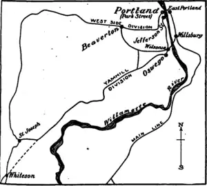At the beginning of the 20th century the Southern Pacific had three routes into Portland, Oregon: the West Side branch (built by the Oregon Central Railroad) and the Newberg branch (built by the Portland and Willamette Valley Railway) on the west side of the Willamette River, and the Brooklyn Subdivision on the east side of the river. The West Side branch and Brooklyn Subdivision met at Portland Union Station, while the Newberg branch terminated at a separate station on Jefferson Street. Although the two stations were approximately 1.4 miles (2.3 km) apart, the lack of a direct connection meant that the rail distance was over 80 miles (130 km).[1]