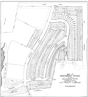Beechmont, a high, woodland tract of several hundred acres, was planned by Eugene and John Lambden in 1902 for the City Realty Company. City Realty was a company formed by the Lambden family, local lawyers and bankers who purchased portions of the Pugsley and Montgomery farms for the creation of a residential community. By damming Pine Brook, the Company created the centerpiece of their development, Beechmont Lake.[4] Met with an unusual public favor from the start, the area was commonly referred to as 'New Rochelle's Tuxedo'.