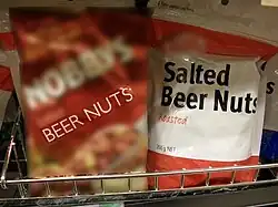 Beer nuts is a snack food of roasted, salted peanuts sold shelled but unhusked and not sweetened. Both generic and branded beer nuts exist and one famous Australian brand is Nobby's.