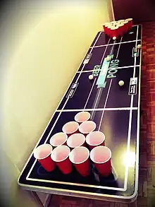 Beer pong, also known as Beirut, is a drinking game in which players throw a ping pong ball across a table with the intent of landing the ball in a cup of beer on the other end. The game typically consists of opposing teams of two or more players per side with 6 or 10 cups set up in a triangle formation on each side.[1] Each team then takes turns attempting to throw ping-pong balls into the opponent's cups. If the team "makes" a cup - that is, the ball lands in it, and stays in it - the contents of the cup are consumed by the other team and the cup is removed from the table. The first team to eliminate all of the opponent's cups is the winner.[2]