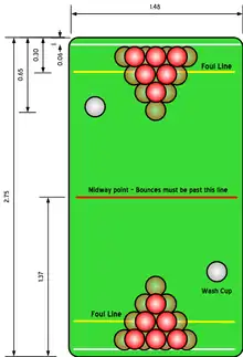 Although the game is typically played on either a ping pong table or a folding banquet table, enthusiasts may create a personalized table for use by friends and visitors. In general, this will be a plywood board cut to proper size, sometimes painted with sports, school, or fraternity symbols and given a liquid-proof coating.[17][18][19] Some companies sell tables, including portable and inflatable tables.[20] However, the game can be played on any flat surface.