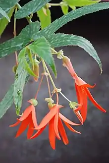 The stems of Begonia boliviensis spring from a tuberous root-stock, and attain a height of between 12 inches (300 mm) and 18 inches (460 mm); the flowers, produced in pairs or threes on short stems in the angles of the obliquely lanceolate leaves, are bright orange/pink in colour, composed of four pointed segments.