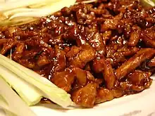 | Moo shu pork | 木須肉 | 木须肉 | mùxūròu | Literally "wood shavings meat" |