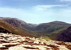 The mountain is a pointed hill, however it is not particularly conspicuous in views being overshadowed by the more imposing and impressive peaks of the Cairngorms which stand nearby. The hill is located at the head of Glen Derry and faces its higher and better-known neighbour Beinn Mheadhoin across the Lairig an Laoigh (The Pass of the Calves). Beinn a' Chaorainn reaches a height of 1083 metres (3553 feet) and qualifies as both a Munro and a Marilyn. The hill's name translates from the Gaelic as “Mountain of the Rowan tree” although today the hill seems bare of any trees.[3] The mountain should not be confused with another Munro also known as Beinn a' Chaorainn which is in Glen Spean above Loch Laggan.
