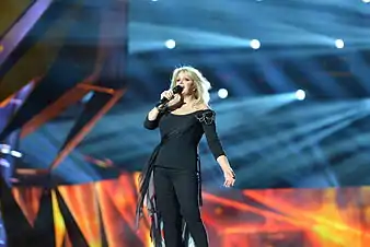 Tyler was selected by the BBC to represent the United Kingdom in the Eurovision Song Contest 2013. The first rehearsal took place on 12 May,[22] the second on 15 May[23] and the performance in front of the jury on 17 May 2013. Tyler's final performance of "Believe in Me" took place on 18 May during the Grand Final, with Anthony Goldsbrough (guitar and backing vocals), Michael Gazzard (guitar and backing vocals), Hayley Sanderson (guitar and backing vocals), Kristen Cummings (keyboards and backing vocals) and Grant Mugent-Kershaw (drums). The song was staged with Tyler standing by a microphone stand with her backing group before walking down the catwalk onto a rising platform.[24]