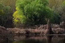 As an elongated floodplain along the Danube, Beljarica is a typical green corridor.[1] The area includes two sizable flood zones, Crvenka (main Beljarica proper) and Kožara. The marshland represents a mosaic of bogs, streams, islands, oxbows, meanders and lush forests and makes a natural riparian zone which receives the surplus of water during the high water level of the Danube, thus preventing the flooding downstream.[2][3] It is not preventing flooding only of its direct hinterland (some 340 km2 (130 sq mi) Pančevački Rit), but also parts of Zemun, New Belgrade and even lowlands upstream the Sava river from its mouth into the Danube.[5][6]