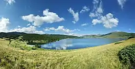 The system of derivations feeds the Belmeken Reservoir situated at an altitude of 1,923 m on the upper course of Kriva reka, a right tributary of the Maritsa. It was constructed in 1964–1974 and serves as the main accumulating and regulating facility of the cascade.[2] Belmeken has two dams, the main one in its northeastern end built of stone with a height of 88.2 m, and a 23.1 m counter dam to the southwest. It forms a lake with a total volume of 144.1 million m3 spanning a territory of 4.6 km2. It serves as the main upper leveler of the two largest pumped storage hydro power plants in Bulgaria.[7]