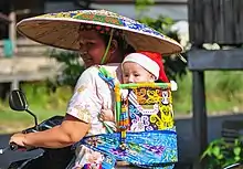 The bening is a traditional baby carrier used by the Dayak people, especially the Dayak Kenyah in Bulungan Regency, North Kalimantan. It is made of carved wood and decorated with colorful wickers and beads, and sometimes also with metal currencies. Variations of images in the carved wood were based on the user's position on society. Images such as tiger and human face motifs indicate that the user is a member of the aristocracy or a noble family, while a plain bening without any decoration indicates the user is a commoner.[1][2][3]