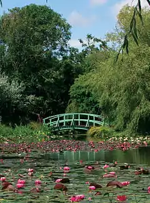 Bennetts Water Gardens is an 8-acre (32,000 m2) garden in Chickerell, near Weymouth, Dorset, in southern England. It holds national and international collections of water lilies which flower from late May through to September. The plants are displayed in a series of ponds and lakes. A feature of the garden is a blue Japanese bridge built in 1999 to celebrate 100 years since Claude Monet painted his famous piece Water Lily Pond 1899.